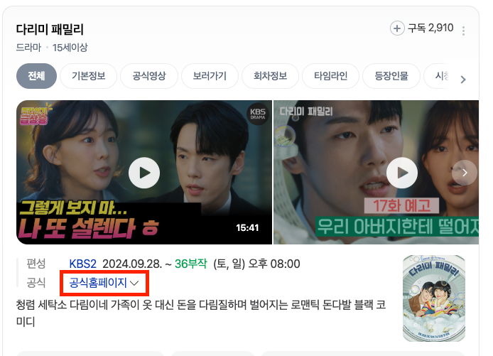 PC로 보는 방법은 매우 간단합니다. 구글이나 네이버,다음과 같은 곳에서 "다리미 패밀리"를 검색해주세요. 그렇게 검색결과가 나오면 아래 이미지처럼 공식 홈페이지를 클릭해줍니다. 접속하셔서 아래 이미지 처럼 다시보기를 클릭하시면 이제 시청하실 수 있습니다.