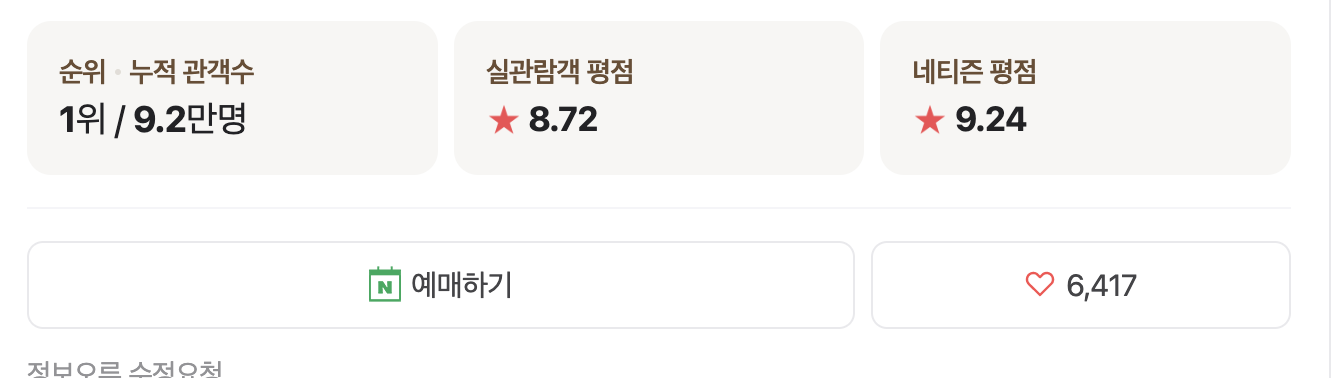 현재 예매 순위 1위를 달리고 있고, 실관람객 평점이 8.72 네티즌 평점이 9.24로 좋은 점수를 받고 있습니다.