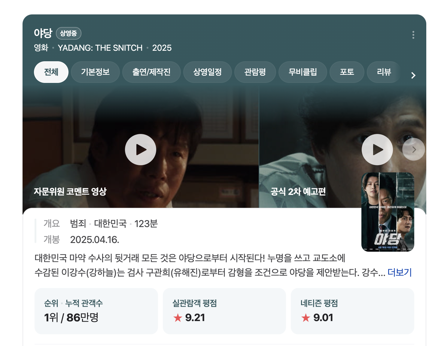 영화 〈야당〉의 정보부터 출연진, 줄거리, 관람평, 쿠키 영상까지 한 번에 정리해드립니다.