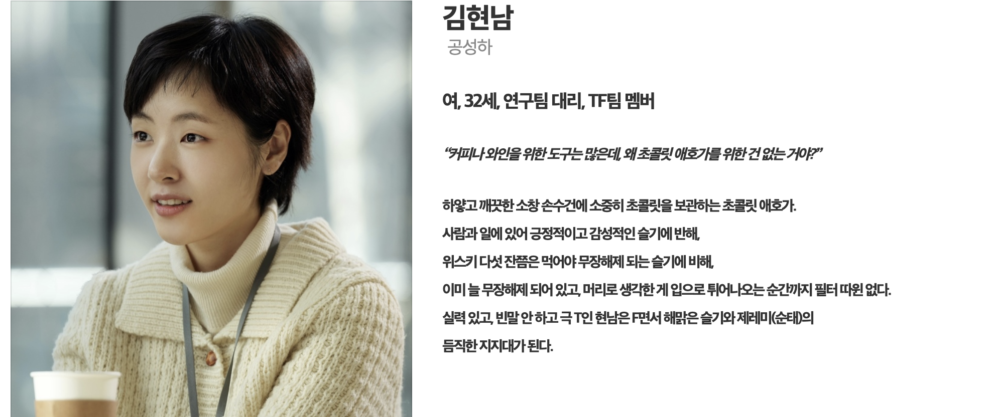 극T(극단적 T 성향)의 소유자로, 실력 있는 직장인이지만 빈말은 절대 하지 않는 냉철한 성격. 하지만 슬기와 제레미를 묵묵히 챙겨주는 따뜻한 면모도 있다.