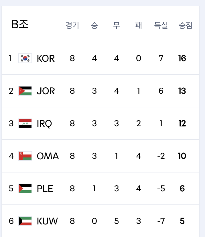 현재 대한민국은 **B조 1위(3승 4무, 승점 16점)**로 조 선두를 지키고 있습니다.
