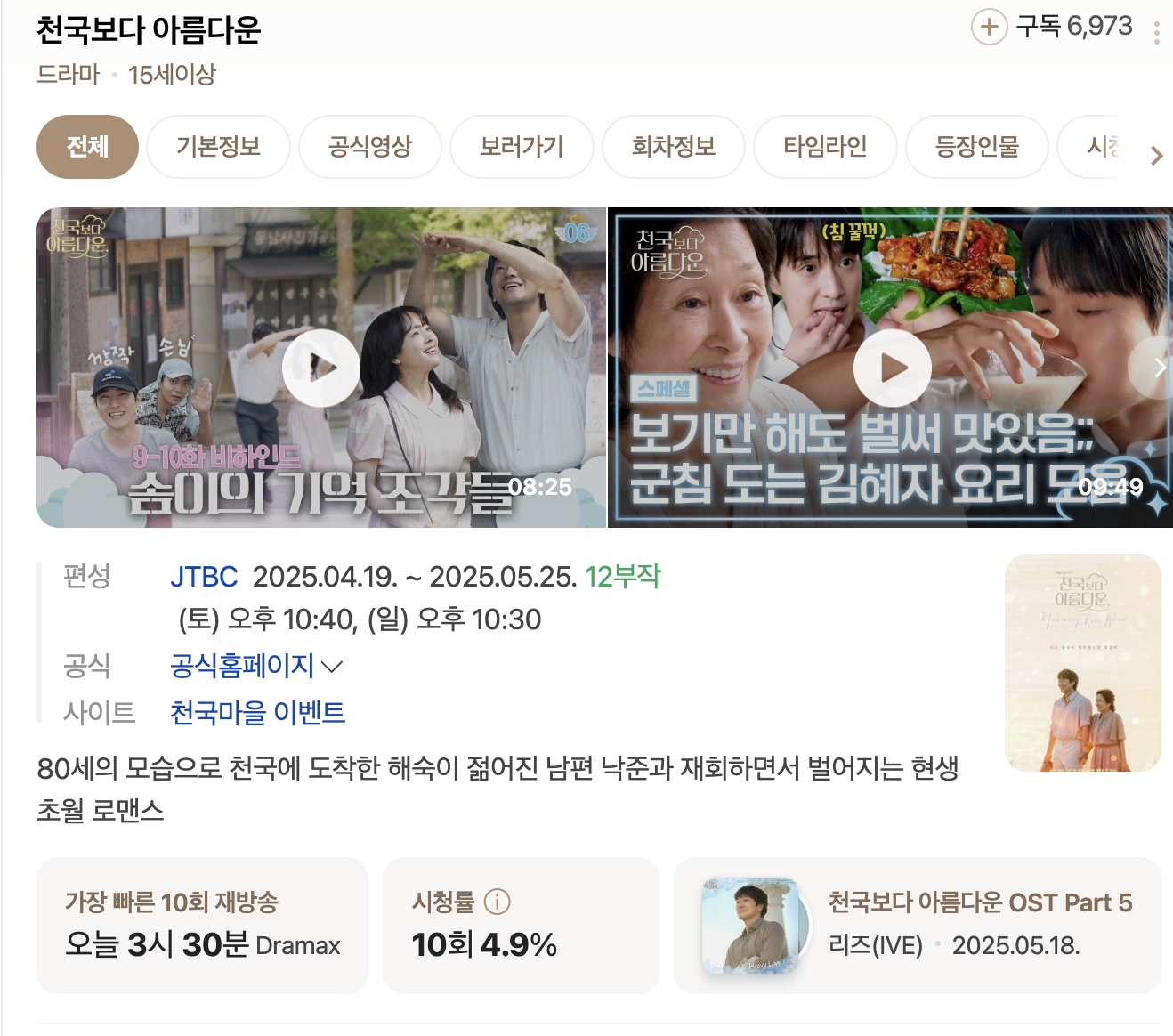 처음에는 따뜻한 환생 힐링 로맨스인 줄 알았습니다. 김혜자와 손석구의 조합, 아름다운 영상미, 삶과 죽음을 넘나드는 메시지까지. 하지만 중반을 지나며 ‘천국보다 아름다운’(JTBC, 2025)은 완
