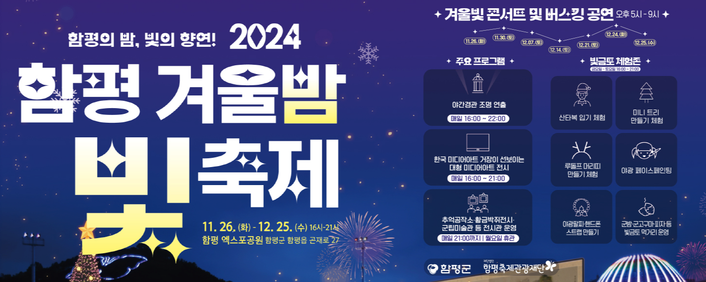 2024 함평 겨울밤 빛축제는 11월 26일부터 12월 25일까지 한 달간 진행됩니다. 겨울의 낭만을 느낄 수 있는 야경과 다양한 체험 행사로 가득한 축제로, 누구나 무료로 즐길 수 있어 부담 없이 방문할 수 있어요.
