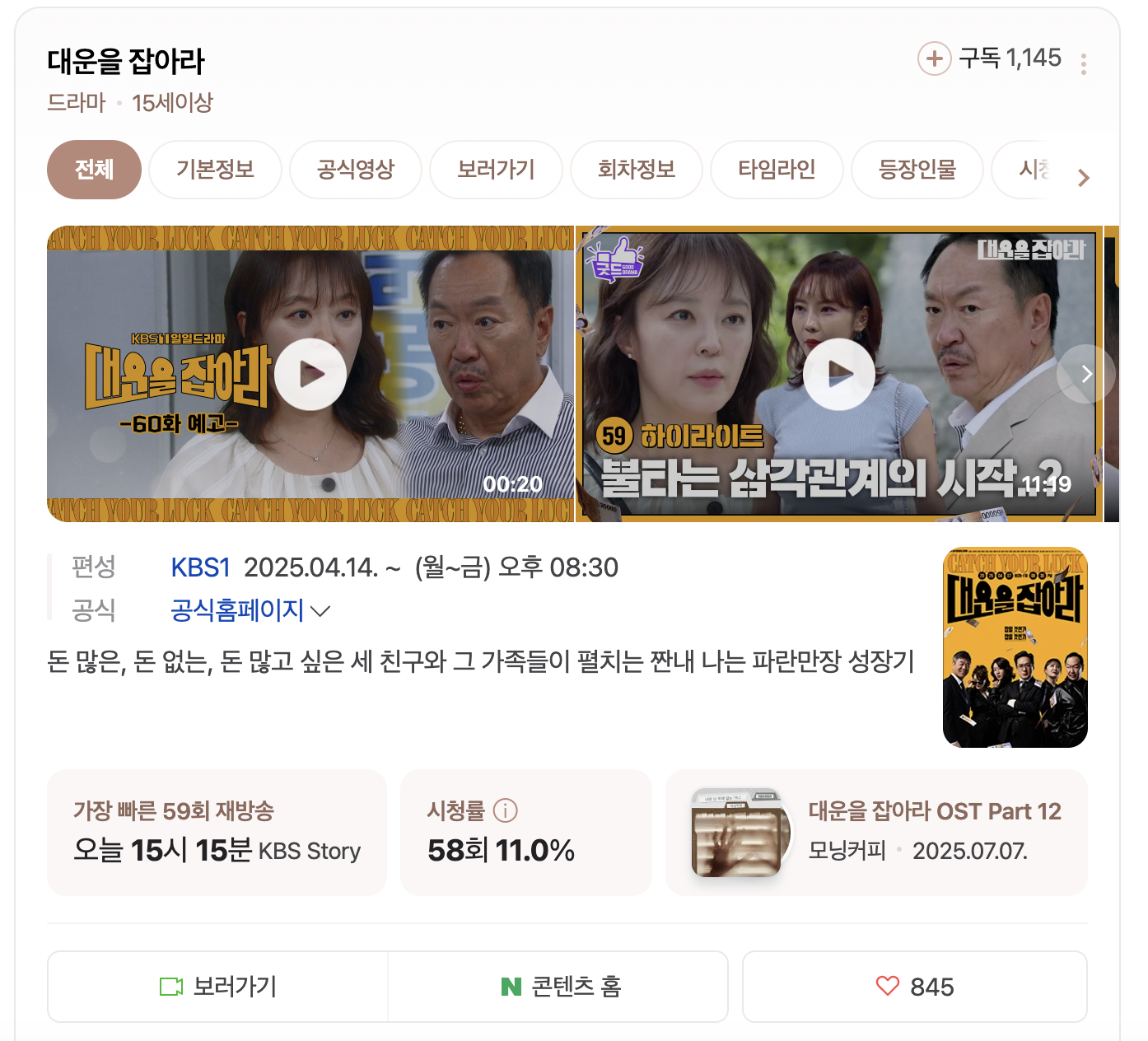 KBS 1TV의 새 일일드라마 **‘대운을 잡아라’**가 오는 2025년 4월 7일 첫 방송을 시작으로 안방극장에 새로운 바람을 불어넣습니다. 기존의 복수극이나 막장 설정을 걷어내고, 현실적인 웃음과 감동이 있는 “돈”과 “가족”의 이야기로 돌아온 작품인데요.