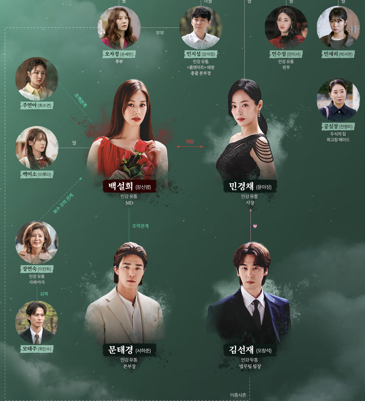 복수의 대상이자 민강유통의 실세. 아버지 민두식의 기업가 기질을 물려받아 재벌가의 차세대 경영자 자리를 노리는 인물입니다. 목적을 위해선 수단과 방법을 가리지 않으며, 백설희와 정면으로 대립하게 됩니다.